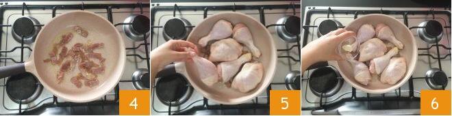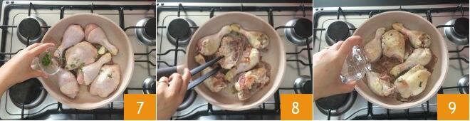 a salsinha 7 e doure os pedaços de frango de ambos os lados 8. Em seguida, regue com o vinho branco 9.