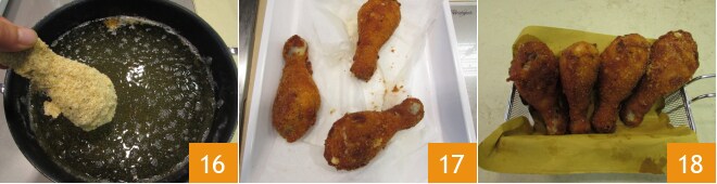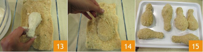 e depois passe novamente na cobertura 13, cobrindo bem 14. Faça isso para todas as coxas e, à medida que for fazendo, coloque em uma bandeja 15.