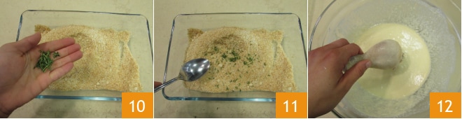 e tempere com pimenta preta e tomilho desfolhado 10. Misture com uma colher 11 e recupere a massa. Mergulhe as coxas de frango segurando pelo osso 12