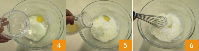 o ovo, a água 4 e a cerveja 5. Misture tudo com um batedor manual 6,