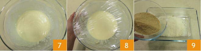 para obter uma massa lisa e sem grumos 7, cubra com filme plástico e leve à geladeira por cerca de 10 minutos 8. Então prepare a cobertura. Em uma tigela, coloque o Grana Padano DOP ralado, a farinha de rosca 9
