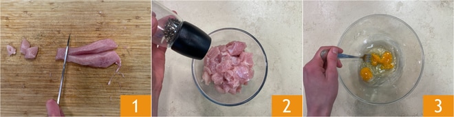 Para preparar o frango frito, comece cortando o peito de frango em pedaços pequenos 1. Coloque os cubos de carne em uma tigela, adicione sal e pimenta 2 e reserve. Em outra tigela, bata os ovos 3.