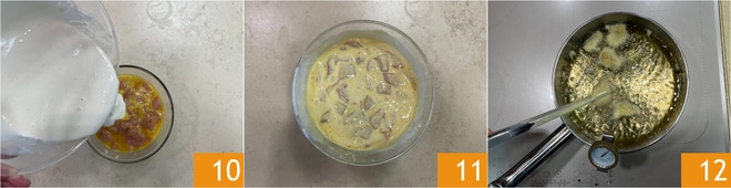 Despeje a massa na tigela com o frango 10 e misture bem 11. Aqueça o óleo em uma frigideira ou wok e, quando estiver bem quente, a cerca de 180°, mergulhe os pedaços de frango 12.