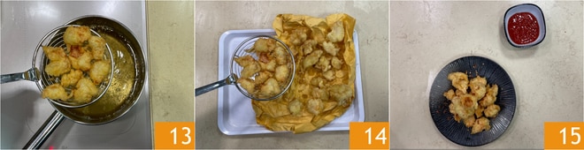 Deixe-os fritar até ficarem dourados, então escorra-os 13 e coloque-os sobre uma bandeja forrada com papel toalha 14. Sirva imediatamente o frango frito bem quente, acompanhado com o molho agridoce 15.