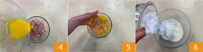 Adicione o ovo batido 4, misture 5 e deixe marinar na geladeira por cerca de uma hora. Prepare a massa: coloque a farinha e o amido em outra tigela 6.