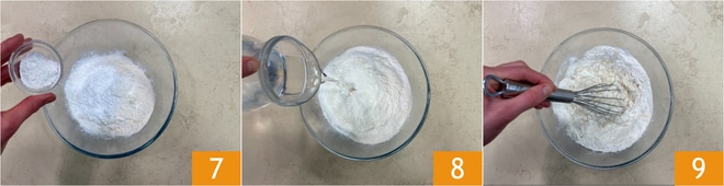 Adicione também o fermento 7. Depois, adicione lentamente a água fria 8, misturando cuidadosamente com um batedor 9 até obter um creme liso e sem grumos.