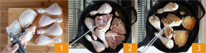 Para preparar o frango na frigideira, primeiro limpe os coxas e sobrecoxas removendo quaisquer penas restantes com um maçarico 1. Aqueça na frigideira o azeite de oliva com um dente de alho com casca, 2 ramos de alecrim e 2 ramos de tomilho. Deixe o óleo absorver o sabor por alguns minutos. Adicione o frango pelo lado da pele 2 e deixe dourar por 5 minutos, vire o frango e cozinhe por mais 5 minutos 3.