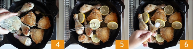 Adicione o vinho branco 4 e deixe todo o álcool evaporar (levará cerca de 3-5 minutos). Adicione um limão não tratado cortado em fatias 5 e continue cozinhando por cerca de 25 minutos. Tempere o frango com sal 6 e pimenta-do-reino.