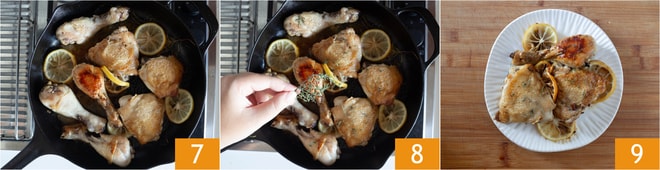 Cozinhe por mais 5 minutos 7. Tempere novamente com algumas folhas de tomilho. Sirva o frango na frigideira bem quente 9.