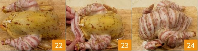 Complete agora com a pancetta: comece a cobrir as coxas 22 e continue pelo corpo, distribuindo as fatias ordenadamente e ligeiramente sobrepostas 23. Quando o frango estiver completamente coberto 24, coloque-o em uma assadeira.