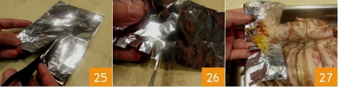 Você pode cobrir a extremidade das coxas de maneira clássica: dobre duas folhas de alumínio sobre si mesmas até reduzi-las a dois retângulos de 6-8 cm 25 e corte-as em tiras de 2-3 cm ao longo do lado longo 26. Cubra a extremidade das coxas, mantendo as tiras voltadas para fora 27.