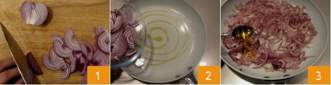 Para preparar o frango recheado assado, comece logo pelo recheio. Primeiro, caramelize as cebolas: limpe-as e corte-as em fatias bem finas 1, coloque-as em uma frigideira antiaderente regada a óleo 2 e adicione finalmente o mel e o açúcar mascavo 3.