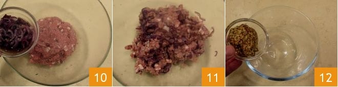 Incorpore agora as cebolas caramelizadas e resfriadas 10 e trabalhe a mistura até obter uma consistência densa 11. Neste ponto, prepare o molho que será adicionado à carne. Coloque a mostarda em uma tigela 12