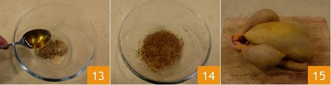 e adicione o mel 13: misture o molho até que fique fluido 14. Limpe agora o frango de eventuais resíduos de penas, passando a superfície pelo fogão aceso. Finalmente, enxágue e seque-o 15.