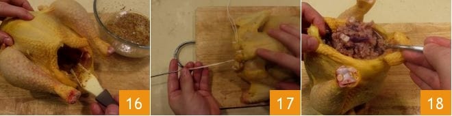 Pincele bem com boa parte do molho de mostarda e mel o interior do frango 16 e costure com agulha e linha de cozinha o dorso para impedir que o tempero vaze 17. Recheie o frango com a ajuda de uma colher, compactando bem o recheio dentro 18.