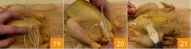 Costure também a outra extremidade 19 e amarre firmemente a costura feita 20. Pincele toda a superfície do frango com o molho restante, incluindo as coxas 21.