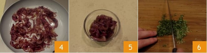 Cozinhe as cebolas por 7-8 minutos em fogo baixo, mexendo de vez em quando, até que fiquem macias e caramelizadas. Quando estiverem prontas 4, transfira-as para uma tigela e deixe esfriar completamente 5. Continue com o recheio: pique finamente os temperos 6,