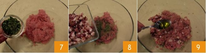 adicione-os à carne de vitela moída 7 junto com o bacon em cubos 8 e depois de adicionar o óleo 9, misture tudo perfeitamente, ajustando o sal e a pimenta.