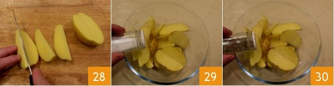 Agora você pode se dedicar ao acompanhamento. Lave, seque as batatas sem remover a casca e corte-as em pedaços 28. Em uma tigela, una batatas, sal 29 e pimenta 30.