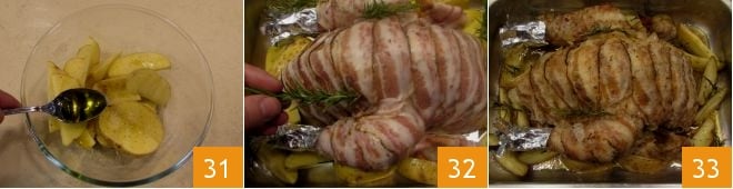 Adicione finalmente o óleo 31 e mexa para misturar os temperos. Aromatize o frango e as batatas com o alecrim picado e com ramos inteiros 32. Finalmente, cubra a assadeira com uma folha de alumínio e asse em forno estático pré-aquecido a 180° por pelo menos 110 minutos (se ventilado, a 160° por 100 minutos). Se após o tempo indicado você perceber que a carne do frango ainda está presa ao osso ou muito rosada, continue cozinhando, até aumentando ligeiramente a temperatura se necessário. Seu frango recheado está pronto 33: sirva bem quente.