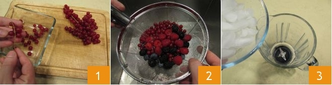 Para preparar o frappê de frutas vermelhas, comece limpando as frutas. Primeiro, tire delicadamente as groselhas vermelhas 1 e coloque-as em uma peneira junto com as outras frutas vermelhas: amoras, mirtilos e framboesas. Em seguida, lave bem em água corrente 2. Neste ponto, coloque o gelo em um liquidificador 3.