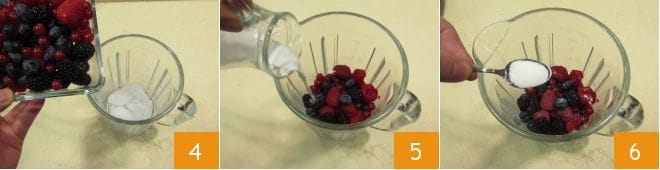 Feito isso, adicione também as frutas vermelhas previamente lavadas 4, o leite frio 5 e o açúcar 6.