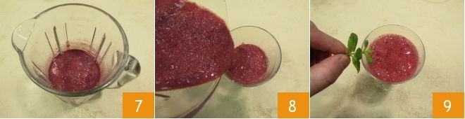 Ligue o liquidificador e bata até triturar completamente as frutas e o gelo, de forma a obter uma mistura cremosa e uniforme 7. Despeje o frappê de frutas vermelhas nos copos 8 e decore com algumas folhinhas de hortelã 9. Saboreie o frappê de frutas vermelhas bem gelado!