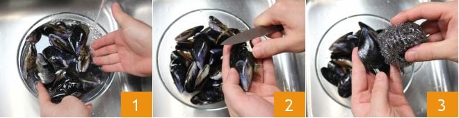 Para preparar a fregola com abóbora e mexilhões, comece limpando os mexilhões. Primeiro, lave-os em água corrente 1; depois, com o dorso de uma faca, remova as incrustações da concha 2 e, com as mãos, retire o bisso, a barbicha que sai dos mexilhões. Em seguida, use uma palha de aço para limpar bem a concha 3, enxaguando-as em água corrente. Deixe os mexilhões de lado por um momento e cuide da abóbora.