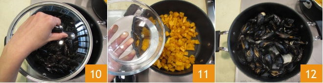 e cubra com uma tampa, permitindo que as conchas se abram 10. Quando a abóbora estiver bem refogada, adicione 100 g de água 11 e cozinhe em fogo médio por cerca de dez minutos. Enquanto isso, assim que os mexilhões abrirem 12,