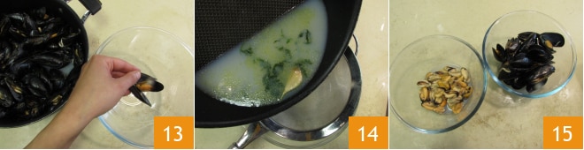 transfira-os para uma tigela 13, deixando o líquido de cozimento na panela, que deve ser filtrado 14 e mantido aquecido. Neste ponto, separe os mexilhões das conchas, tomando cuidado para não se queimar, e deixe alguns inteiros para a decoração final 15.
