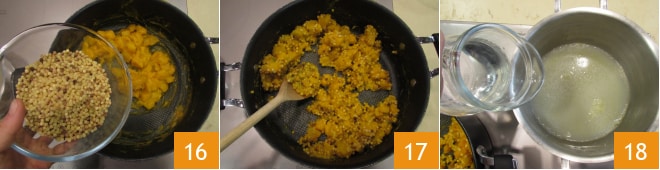 Neste ponto, remova o dente de alho da abóbora, adicione a fregola 16 e deixe tostar 17. Coloque o líquido de cozimento dos mexilhões em uma panela e adicione 300 g de água. Aqueça tudo no fogo 18.