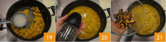 Após alguns minutos, adicione a primeira concha do caldo de mexilhões 19 e continue cozinhando, adicionando mais caldo apenas conforme necessário e ajustando a quantidade de acordo com a consistência da preparação. Tempere com sal e pimenta 20 e mexa frequentemente. Levará cerca de 20 minutos. Quando a fregola estiver cozida, adicione os mexilhões 21.