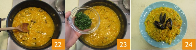 Misture 22 e tempere com a salsinha picada 23. Sirva a fregola com mexilhões e abóbora, decorando com os mexilhões inteiros reservados 24!