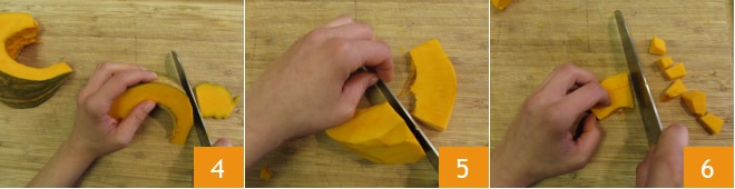 Remova a casca com uma faca 4 e quaisquer sementes ou filamentos internos. Agora, corte-a primeiro em fatias 5 e depois em cubos 6.