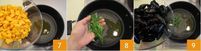 Doure um dente de alho com um fio de azeite em uma panela, adicione a abóbora 7 e deixe refogar por alguns minutos. Enquanto isso, em outra panela, coloque alho, azeite e salsinha 8, deixe refogar também, então adicione os mexilhões 9