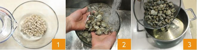Para preparar a fregola com amêijoas e grão-de-bico, você deve ter deixado o grão-de-bico de molho por pelo menos 12 horas (ou uma noite inteira), em uma tigela cheia de água 1. Depois, escorra o grão-de-bico que estará reidratado após as horas de molho e cozinhe-o em água salgada até que fique macio (levará cerca de um par de horas) (alternativamente, você pode cozinhar o grão-de-bico ainda seco com sal e alecrim em panela de pressão por cerca de 50 minutos). Cuide das amêijoas, enxágue-as 2 e depois deixe-as em uma peneira com uma tigela embaixo sob um fio de água corrente por cerca de 30 minutos para eliminar a areia. Em uma panela, coloque um fio de óleo e alguns dentes de alho, adicione as amêijoas 3, cubra com a tampa e deixe-as cozinhar até que se abram.