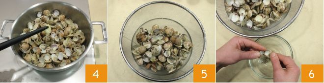 Uma vez prontas, elimine os dentes de alho 4 e escorra-as 5 tendo o cuidado de conservar a água delas que servirá para cozinhar as amêijoas. Descasque-as 6 deixando algumas inteiras de lado para decorar os pratos.