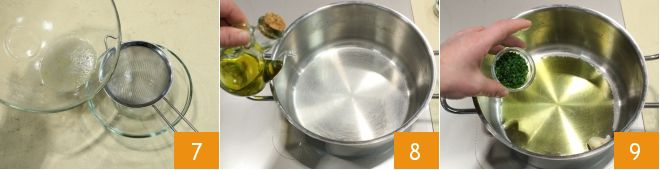Coe a água de cozimento das amêijoas que você coletou 7 e use-a para diluir o concentrado de tomate. Agora ocupe-se da cocção da fregola, coloque em uma panela quente o azeite de oliva 8, adicione 2 dentes de alho inteiros ou esmagados, se preferir, e uma colher de salsa picada 9.