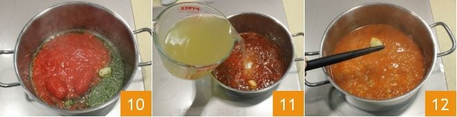Em seguida, adicione os tomates pelados 10 e o concentrado de tomate dissolvido no líquido das amêijoas, cozinhe por alguns minutos. Depois, despeje algumas conchas de caldo de legumes 11 para prepará-lo, siga a receita do Caldo de legumes. Elimine o alho com uma pinça de cozinha 12