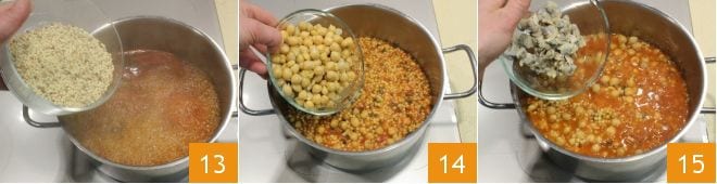 depois despeje a fregola 13 que deve cozinhar por cerca de 10-15 minutos. Continue a cocção adicionando aos poucos o caldo. No meio da cocção, adicione também o grão-de-bico 14. No final da cocção, adicione também as amêijoas descascadas e desligue o fogo 15.