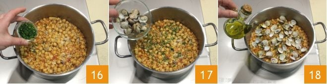 Ajuste o sal e a pimenta, aromatize com outra colher de salsa picada 16, depois adicione também as amêijoas com a casca que você reservou 17. Para terminar, tempere com um fio de azeite de oliva 18. Sua fregola com amêijoas e grão-de-bico está pronta para ser servida, saboreie-a bem quente acompanhada com pão carasau.