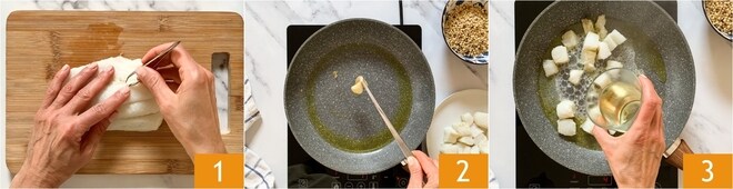 Para realizar a fregola com bacalhau, primeiro pegue o bacalhau já dessalgado e remova as espinhas 1, depois corte-o em pedaços pequenos. Amasse um dente de alho e coloque-o em uma panela para dourar com 20 g de azeite 2, e depois remova-o. Adicione o bacalhau na panela e regue com o vinho branco 3.