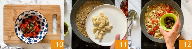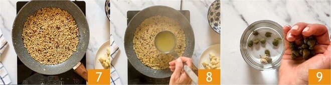 Deixe tostar 7 e continue o cozimento como se fosse um risoto, ou seja, adicionando o caldo de legumes quente conforme necessário até cobrir 8, deixando que seja absorvido antes de adicionar mais. Verifique o cozimento da fregola após 12 minutos. Coloque as alcaparras de molho em água morna 9 após enxaguá-las bem em água corrente, para dessalgá-las.