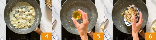 Cozinhe por 7 minutos, depois reserve 4. Na mesma panela, despeje mais 20 g de azeite 5, aqueça ligeiramente, depois adicione a fregola 6.