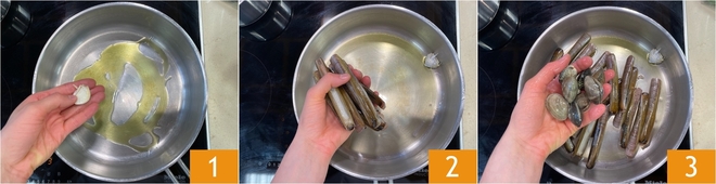 Para preparar a fregola com frutos do mar e salicornia, aqueça em uma panela um fio de azeite de oliva extra virgem com um dente de alho com casca 1, depois adicione as navalhas 2 e as amêijoas 3.