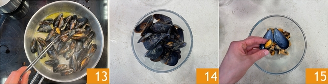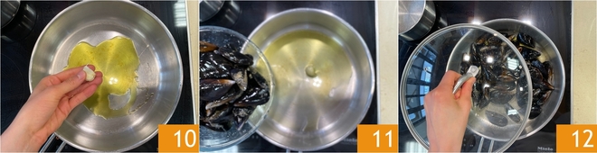 Em uma segunda panela, aqueça novamente um fio de azeite com o alho com casca 10, adicione os mexilhões já limpos 11, tampe com a tampa 12 e deixe abrir em fogo alto.