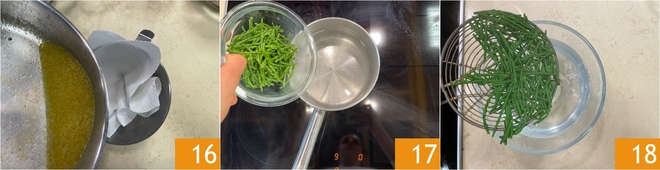 Também neste caso, coe o caldo de cozimento 16 e junte-o à água de cozimento dos outros frutos do mar. Agora passe para a preparação da emulsão de salicornia: branqueie 50 g de salicornia por 30 segundos em água fervente 17, escorra e esfrie imediatamente em água e gelo 18.