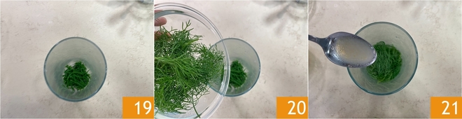 Coloque no copo do liquidificador a salicornia 19, o endro, o funcho 20 e uma colher de sopa de água dos moluscos 21.