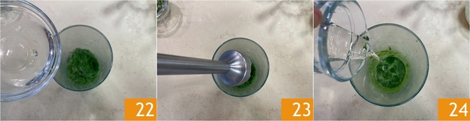 Adicione um pouco de água gelada 22, depois bata 23. Despeje fio a fio o óleo de sementes 24 enquanto bate até obter um molho fluido e brilhante de cor verde intensa.