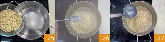Agora torre a fregola em uma caçarola seca 25. Quando os grãos estiverem quentes ao toque, inicie a cozimento como se fosse um risoto, adicionando o caldo de cozimento dos moluscos coado uma concha de cada vez 26 alternando com água quente para equilibrar a salinidade 27.